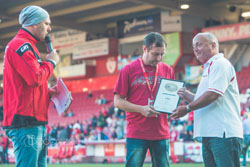 Im Vorfeld wurde die Ehrung mit Pressesprecher Lars Töffling abgesprochen. So traf sich Udo Glaß eine viertel Stunde vor Anpfiff mit Sven Hoffmann, Mediengestalter und Echo-Layouter, am Rande des Spielfeldes. Die Übergabe der Stadionheft.de-Urkunde wurde vom FCE-Stadionsprecher moderiert und vor 6.700 Zuschauern frentisch mit Applaus gefeiert. |